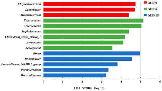 The Lefse analysis in intestinal microflora of American eel based on genus level is shown in Figure 5. A total of 14 bacterial species were noted with significant differences among the MBP0, MBP6, and MBP18 groups (p < 0.05). Higher relative abundances of Chryseobacterium, Leucobacter, and Microbacterium were found in the MBP0 group, while higher relative abundances of Enterococcus, Macrococcus, Staphylococcus, Clostridium-sensu-stricto, Aeromonas, and Schlegelella were observed in the MBP6 group, and higher relative abundances of Bosea, Rhodobacter, Prevotellaceae_NK3B31_group, Pedomicrobium, and Brevundimonas were shown in the MBP18 group.