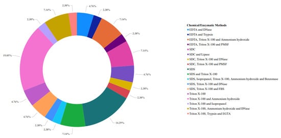 Chemical/enzymatic methods for pancreas decellularization found in the PubMed database between 2009 and 2021. The most used method to date includes the use of Triton X−100 and ammonium hydroxide (17.39%), followed by the use of only SDS (13.04%), while the rest of the studies addressed the use of different types of detergents (ionic and non-ionic) simultaneously in the decellularization process.