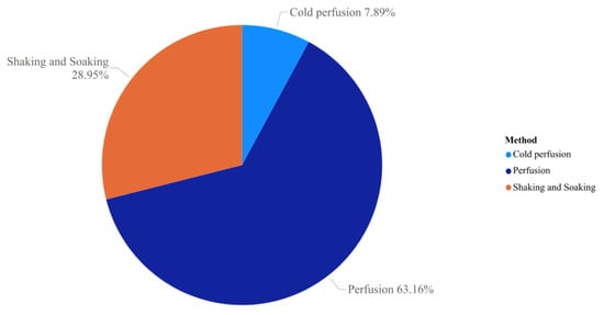 Physical methods used in pancreas decellularization found in the PubMed database between 2009 and 2021. The most used physical method is perfusion (63.16%), followed by agitation and immersion (28.95%) which is classified as a mechanical protocol and cold perfusion (7.89%) that uses temperature to assist in the process.