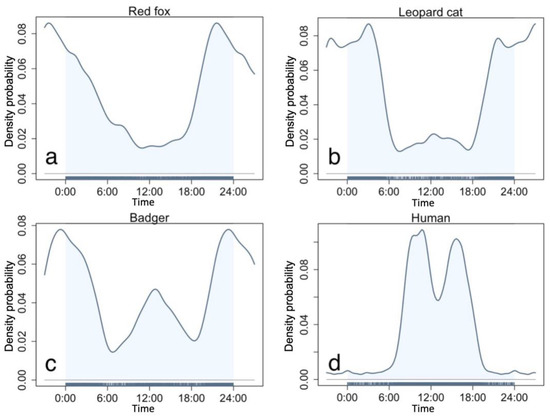 We obtained 2445 (number of detected stations N = 139), 4893 (N = 147), and 2697 (N = 142) independent detections of leopard cats, red foxes, and badgers, respectively. All three mesocarnivores exhibited mostly nocturnal activity patterns (Figure 2). The red fox was almost strictly nocturnal, being active mainly after 18:00 and before 6:00, with one peak at 20:00 (Figure 2a). The leopard cat was also nocturnal, with two activity peaks at 3:00 and 20:00 (Figure 2b). Its first peak at 3:00 differed to that of the red fox, while the second peak co-occurred. The badgers were cathemeral and demonstrated two activity peaks, one high activity peak around midnight and one relatively lower peak at noon, with little activity at crepuscular hours (Figure 2c). As the three mesocarnivores are mostly nocturnal, their initial activity overlap is considerably high in the study area, with a 0.88 overlap coefficient between leopard cat and red fox, 0.83 between badger and red fox, and 0.84 between leopard cat and badger (see Figure S1a–c). Meanwhile, we recorded 11,306 independent detections of humans from 163 camera stations, with two activity peaks at 8:00–10:00 and 15:00–17:00, respectively (Figure 2d).