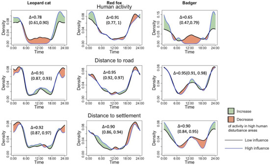 Although the changes in the overlap coefficient we observed were not statistically significant, the animals’ activity peaks may have shifted to accommodate the increased nocturnality. For instance, at the sites with a high level of human disturbance, while the leopard cat displays an activity peak at 20:00–22:00, the red fox shifted its activity peak from 20:00–22:00, which overlapped with the peak of the leopard cat, to 1:00–2:00 (see Figure 3). As a result, temporal overlap remained at a similar level with non-overlapping activity peaks at each human activity level.
