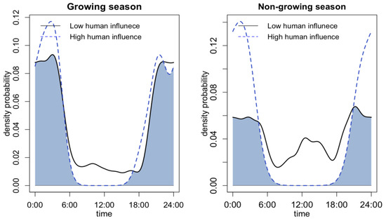 We modeled the activity pattern of each study species with a non-parametric kernel density function using the overlap package in R [55,56]. This model assumes that individual detections arise from a continuous probability density function [9]. We first converted time into radians, then generated the activity pattern function of each study species at each human disturbance level. We then quantified the overlap between activity curves of each species pair using the overlap coefficient, a value that ranges from 0 to 1 [56], which is calculated with the sample size appropriate method with 10,000 bootstraps to obtain a 95% confidence interval [56]. We first obtained the function and overlap coefficient on how the three mesocarnivores species groups offset at the two human disturbance levels among the three disturbance variables. To quantify the shift in mesocarnivore activity with human activity, the overlap coefficient between humans and each mesocarnivore was calculated with a 95% confidence interval obtained from bootstrapping. In addition, we modeled the function at the growing season (i.e., May to October) and non-growing season (i.e., November to April), respectively, to examine whether the activity overlap differed between seasons for specific species pairs.