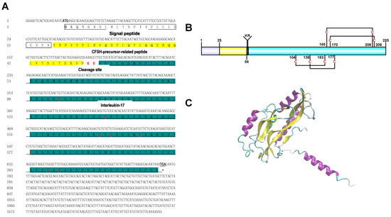 We obtained a 1241 bp PtCFSH cDNA (Genbank accession number: ON929327) comprising a 19 bp 5′-untranslated region (UTR), 678 bp ORF, and 542 bp 3′-UTR with a poly (A) tail (Figure 1). A sequence analysis of the 678 bp ORF revealed 225 amino acids with a 24 aa signal peptide, 31 aa CFSH-precursor-related peptides, a 2 aa cleavage site and a 166 aa interleukin-17 domain containing eight cysteines, forming four disulfide bonds (Figure 1A,B). The three-dimensional structure of the CFSH was composed of α-helix and connected random coils, as shown by the Alphafold2 results (Figure 1C).