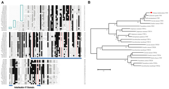 Multiple sequence alignment and phylogenetic tree of the CFSH mature peptide in decapoda. (A) Multiple amino acid sequence alignment of insulin family peptides. Most of the CFSH sequences were borrowed from previous works by [21]; other sequences were shown in Table 2. Cleavage site “KR” is marked with a green box. The eight cysteines are marked in red and the interleukin-17 domain is marked with a blue underline. (B) Phylogenetic tree of CFSHs in crustaceans. Phylogenetic analysis was conducted by the neighbor-joining method in MEGA7. The percentage of replicate trees in which the associated taxa clustered together in the bootstrap test (1000 replicates) was shown next to the branches. PtCFSH was indicated by a red dot.