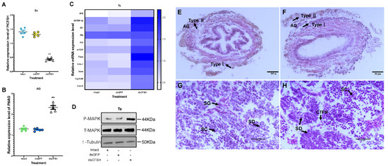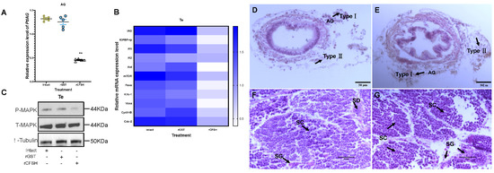 Effects of long-term rPtCFSH injection on gene and protein expression of P. trituberculatus. (A) Effect of rPtCFSH on PtIAG in AG tissue. The expression levels of PtIAG were examined in the intact group and after the in vivo injection of rGST and rPtCFSH. ** indicates acceptance p < 0.01. (B) Effect of rPtCFSH on a series of genes in the testis. The heatmap levels of PtIAG, PtIGFBP-rp, PtIR1, PtIR2, PtAkt, PtmTOR, PtFoxo, PtKifc-1, PtVasa, PtCyclinB, PtCdc-2 were examined in the intact group and after the in vivo injection of rGST and rPtCFSH. Different colors of the same tested gene between the experimental and control groups indicated significant differences. The darker the color in the heat map, the higher the relative expression of the tested genes and vice versa. (C) Effect of rPtCFSH on phosphorylated-MAPK in testis. Phosphorylated MAPK, total MAPK and β-tubulin were detected in the intact group, rGST and rCFSH injection groups, with T-MAPK and tubulin serving as internal references. (D) Histological sectioning and H&E staining of AG after rGST injection. The arrows indicate type I and II AG cells, and the scale bar is marked in the lower right corner. (E) Histological sectioning and H&E staining of AG after rPtCFSH injection. The arrows indicate type I and II AG cells, and the scale bar is marked in the lower right corner. (F) Histological sectioning and H&E staining of the testis after rGST injection. The arrows point to the spermatogonia (SG), spermatocytes (SC) and spermatid (SD), respectively. The scale bar is shown in the lower right corner. (G) Histological sectioning and H&E staining of testis after rPtCFSH injection. The arrows point to the spermatogonia (SG), spermatocytes (SC) and spermatid (SD), respectively. The scale bar is shown in the lower right corner. Vertical bars represent means ± SEM (n = 5). Significant differences among stages are indicated by different letter labels (one-way ANOVA followed by post hoc Tukey’s multiple group comparison p < 0.05).