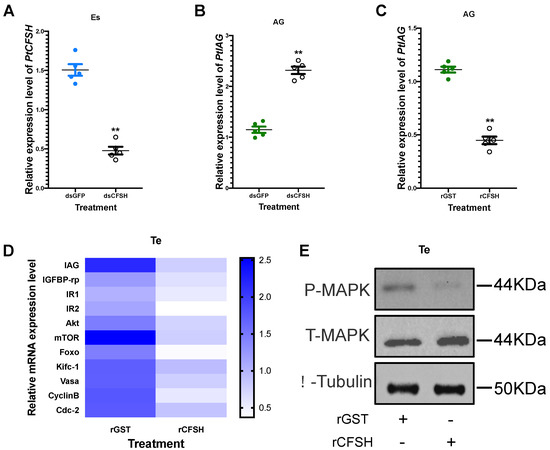 Effects of rPtCFSH and dsPtCFSH in vitro treatment on gene and protein expression of P. trituberculatus. (A) Interference efficiency of in vitro co-culture of the eyestalk and AG and treated with dsPtCFSH. The mRNA transcription of PtCFSH was significantly reduced in the eyestalk compared to dsGFP, with an interference efficiency of 71.4%. ** indicates acceptance p < 0.01. (B) Effect of in vitro co-culture of the eyestalk and AG and treated with dsPtCFSH on PtIAG. The expression of PtIAG was remarkably increased in the AG. ** indicates acceptance p < 0.01. (C) Effects of rPtCFSH in vitro treatment on PtIAG. qPCR results showed that IAG in AG was down-regulated dramatically after being subjected to PtCFSH. ** indicates acceptance p < 0.01. (D) Heat map of gene expression levels in the testis after rPtCFSH in vitro treatment. Different colors of the same tested gene between the experimental and control groups indicated significant differences. The darker the color in the heat map, the higher the relative expression of the tested genes and vice versa. (E) Changes in phosphorylated-MAPK after rPtCFSH in vitro treatment of testis. Total-MAPK, β-tubulin as internal reference protein. The scale bar is shown in the lower right corner. Vertical bars represent means ± SEM (n = 5). Significant differences among stages are indicated by different letter labels (one-way ANOVA followed by post hoc Tukey’s multiple group comparison p < 0.05).