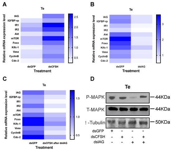 To find out whether the negative regulatory effect of the CFSH is achieved through IAG, the changes in expression levels of several classical insulin pathway genes, including IAG itself, insulin-like growth factor banding protein-related peptide (IGFBP-rp), insulin-like hormone receptor 1 (IR1), IR2, protein kinase B (Akt), mammalian target of rapamycin (mTOR), and forkhead transcription factors (Foxo) [30,31], were further determined in the testis in the two treatments. In addition, since the insulin pathway activates the phosphorylation of MAPK [32], the change in the phosphorylated MAPK levels were also examined using Western blotting. As expected, the expression of insulin pathway genes and phosphorylated MAPK levels were reduced by rPtCFSH injection and induced by PtCFSH silencing (Figure 3C,D and Figure 4B,C). Therefore, it was speculated that the CFSH can inhibit the production of IAG, which, in turn, affects the testicular development.