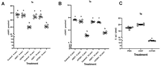 Most neuropeptides use the G protein-coupled receptor (GPCR) as their membrane receptor, and the signaling system needs the participation of second messengers [27]. To explore which second messengers are involved in the signal transduction of PtCFSH, the levels of cAMP and cGMP, as well as the activity of nitric oxide synthetase (NOS), were determined in in vitro testis experiments. Remarkable down-regulation at 5 min and 15 min after adding rPtCFSH was shown by both cAMP and cGMP levels compared to the control group (Figure 7A,B). In addition, the NOS enzymatic activity was significantly diminished after adding rPtCFSH, suggesting a decrease in the NO level (Figure 7C).