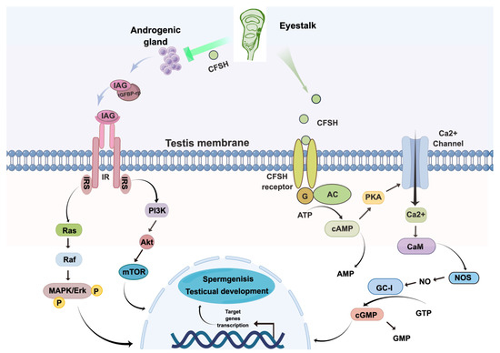 In conclusion, the P. trituberculatus CFSH was identified, cloned and expressed in the recombinant form. The physiological functions of PtCFSH on the AG and testis were investigated using the RNAi and recombinant protein injection in a series of in vivo and in vitro experiments. It was confirmed that PtCFSH can negatively regulate the spermatogenesis and testicular development via a CFSH–IAG–testis endocrine axis. PtCFSH may also act directly on the testis, dependent or independent of IAG. The signaling system of PtCFSH involved the participation of cAMP, cGMP, and NO, which resembles the MIH signaling pathway. In order to summarize, a hypothetical pathway for the mode of the CFSH action in P. trituberculatus was constructed by figdraw (Figure 8).