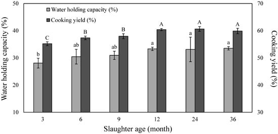 The water-holding capacity of meat is an indicator of improved juiciness and is an important factor in determining the functional properties and process suitability of meat products [30]. The water-holding capacity and cooking yield of black goats according to the slaughter age are shown in Figure 1, and the water-holding capacity tended to increase with slaughter age.