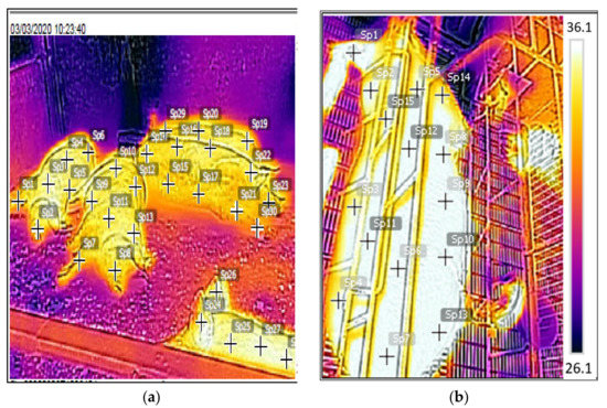 (a) Thermographic image of sows in collective gestation, (b) thermographic image of a lactating sow.