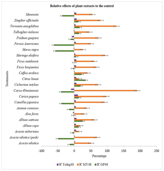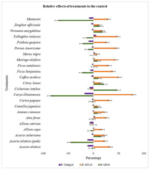 The inclusion of C. intybus plant extract brought about the least PF (7.8 mg mL−1) which is not statistically different from the control (11.1 mg mL−1). Meanwhile, the influence of C. illinoinensis and monensin sodium on the PF differed significantly (p < 0.0001) from each other and all other plant extracts including the control after 16 h of fermentation. The partitioning factor also differed (p < 0.0001) amongst extracts at 48 h of incubation. P. americana (14.32 mg mL−1) had the highest partitioning factor, which differed significantly from all other treatments and control except M. nigra, C. japonica, and A. nilotica (pods) (12.56, 9.79, and 10.56 mg mL−1, respectively). While the least PF was obtained from the plant extract of C. limon (4.04 mg mL−1) which did not differ statistically from the control. Figure 1 and Figure 2 represent the relative effect of the treatment (plant extracts) to control on Trdeg, MY and GP.