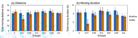 The total distance moved (a) and cumulative moving duration (b) before and after injection for each group. The data in the figure are total measured data for 12 h. Each error bar represents the standard error. S is the seawater control group, K1 and K2 are the neuropeptide treatment groups, and H/M/L represent high, medium, and low concentrations. *, significant difference within the group (p < 0.05).
