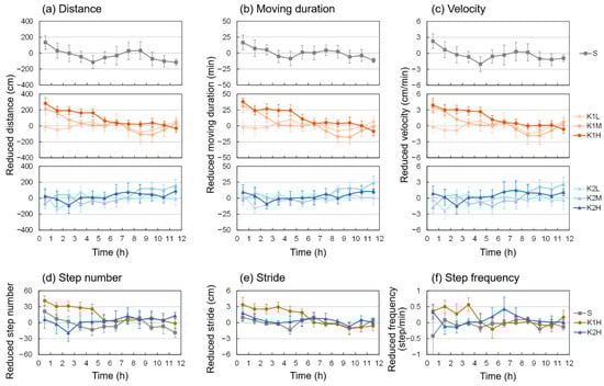 Trend of locomotor behavior of A. japonicus within 12 h after injection compared with before injection: (a) distance; (b) moving duration; (c) velocity; (d) step number; (e) stride length; (f) step frequency. Behavioral data were measured hourly, and the values in the figure are the differences (ΔY) at the same moment in the two adjacent days before and after injection. The error bars in the figure represent the standard error (n = 8 for each group). S is the seawater control group, K1 and K2 are the neuropeptide treatment groups, and H/M/L represent high, medium, and low concentrations.