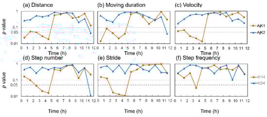 Significance of differences between different neuropeptide groups changed over time: (a) distance; (b) moving duration; (c) velocity; (d) step number; (e) stride length; (f) step frequency. (a–c) show the difference between different dose levels (0/L/M/H) of K1 (or K2), which were compared by one-way ANOVA. (d–f) The difference between the two high concentration treatment groups (K1H and K2H) and the seawater control group, which were compared using t-tests (two-tailed). The significance level was set at 0.05.