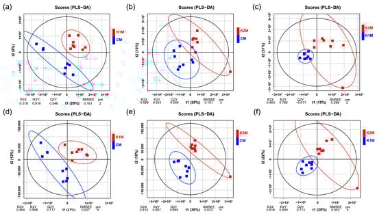 PLS-DA scores plot of longitudinal muscle metabolite profiling. (a) CM (in blue) vs. K1M (in red) in positive ion mode, Q2 = 0.546; (b) CM (in blue) vs. K2M (in red) in positive ion mode, Q2 = 0.659; (c) K1M (in blue) vs. K2M (in red) in positive ion mode, Q2 < 0 (unreliable); (d) CM (in blue) vs. K2M (in red) in negative ion mode, Q2 = 0.717; (e) CM (in blue) vs. K2M (in red) in negative ion mode, Q2 = 0.895; (f) K1M (in blue) vs. K2M (in red) in negative ion mode, Q2 = 0.713.