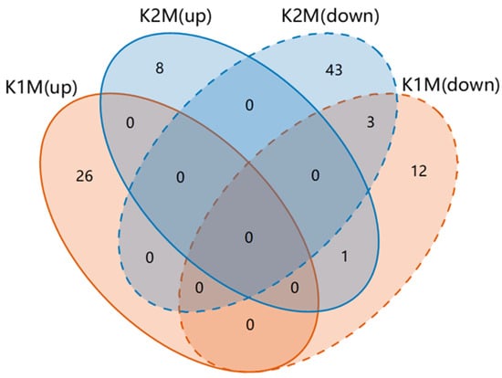 Venn diagram of all differential metabolites from the experimental groups (K1M and K2M) both in positive and negative ion mode. Circles in orange indicate the AjK1 treatment group; circles in blue indicate the AjK2 treatment group; solid lines mean that metabolites are up-regulated; dashed lines mean that they are down-regulated.