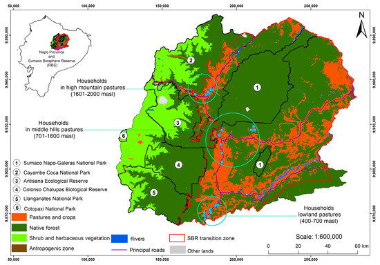 This contribution was carried out in the Ecuadorian Amazon Region (EAR), where the agricultural frontier is expanding at an unprecedented rate [23,24], with cattle pastures being one of the main drivers of land use change and deforestation [24,25,26]. It is estimated that in this region, in 2014, there were approximately 1.2 million hectares of pasture for extensive livestock grazing [9], contributing to meeting the national and international demand for animal protein and milk [27]. On the other hand, despite the low income from agricultural activities in general in the rural EAR, the livestock-based livelihood strategy is the most economically profitable source of income for households compared to other strategies, based on crops and forestry activities at household level [1,28]. Particularly, in the SBR, it is estimated that 56.1% of the productive activities carried out by local settlers are based on subsistence methods focused on cattle ranching [4].
