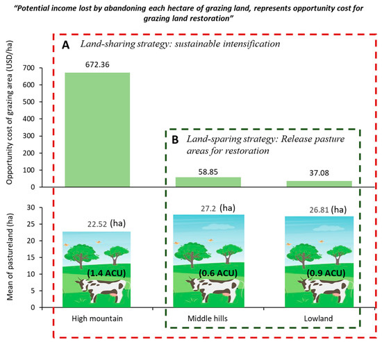 Opportunity cost of grazing area, represented by potential income lost by abandoning one hectare of grazing area. Additionally, suggested intensification strategies: (A) Potential for land-sharing and (B) for land-sparing approach along altitudinal gradients pastoral systems. Napo, Ecuador. (ACU is the Adult Cattle Unit).