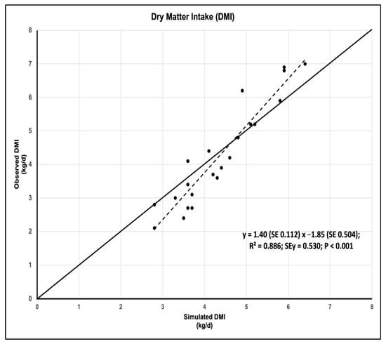 Moreover, the analysis of MSPE for the relationship between the observed and simulated values showed that the main component (59.8% of MSPE) was the error due to random data disturbance. There were no significant differences (p = 0.505) between the observed and simulated values, and therefore, error attributed to the overall bias of prediction accounted for only 2.1% of MSPE. In contrast, the error attributed to the deviation in the regression slope from unity was 38% of MSPE, as, in fact, low intakes (less than 4.6 kg/d) were overestimated, and high intakes (more than 4.6 kg/d) were underestimated with the RUMINANT model (Figure 1). The concordance correlation coefficient (CCC = 0.87) showed high reproducibility of the actual intakes using this model, with both precision and accuracy coefficient approaching unity (Table 3).