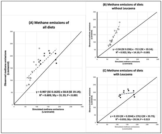 Relationship between the simulated and observed methane emissions for (A) all diets; (B) diets without Leucaena: ◇ Toledo grass, ◻ = Cayman grass, and ◯ = Star grass plus kudzu (70:30); and (C) diets with Leucaena: ◼ = Cayman grass plus L. diversifolia (70:30), ▩ = Cayman grass plus L. leucocephala (70:30), and ◆ = Toledo grass plus Canavalia plus L. diversifolia (70:15:15).