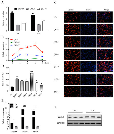 The qPCR showed that the QKI was upregulated in the BF muscle compared with the LD muscle. The expression was significantly increased in the QKI-1, QKI-5 group relative to the QKI-4, QKI-7 and QKI-3, QKI-6 groups (Figure 2A). The transcript-expression trends during the myoblast differentiation were determined by the overexpression of all six QKI isoforms in the BF myoblasts. The expression level of the QKI-15 group was significantly higher than those of the other isoforms during the myoblast differentiation. The highest expression level was determined for d 6 of the differentiation (Figure 2B).