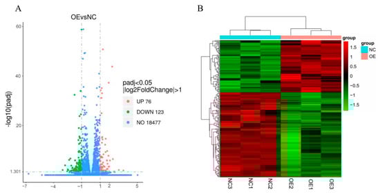 The EBSeq algorithm (|log2(FoldChange)| > 1 and padj < 0.05) disclosed 199 DEGs between the OE and NC groups. Of these, 76 were upregulated and 123 were downregulated. ACTA1, CAV3, TNNC1, TNNC2, TNNI1, TNNT1 and TNNT3 were highly significantly differentially expressed in relation to muscle growth and development. The distribution of the DEGS in the two treatment groups is displayed in a volcano plot (Figure 3A). The DEGs were selected and pooled as gene sets for cluster analysis. The genes in the heatmap with similar expression patterns were clustered together. Figure 3B shows that three repeats had highly similar gene-expression levels and patterns between groups, whereas different gene groups had distinct patterns. Thus, both sample groups had good repeatability and clustering effects.