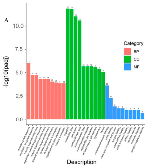 The DEGs were annotated according to the molecular-function, cellular-component, and biological-process GO categories. The 10 most significantly enriched pathways in each function are shown in Figure 4A (Table S3). For the molecular-function terms, the DEGs were enriched mainly in binding functions, such as cytoskeletal protein binding, actin binding, and structural constituents. For the cellular-component terms, the DEGs were enriched mainly in myofibril. For the biological-process terms, the DEGs were enriched mainly in muscle-structure development, muscle-tissue and organ development, and muscle-cell development. We also selected 10 GO terms directly involved in muscle growth and development, and obtained 20 DEGs associated with them (Table 2).
