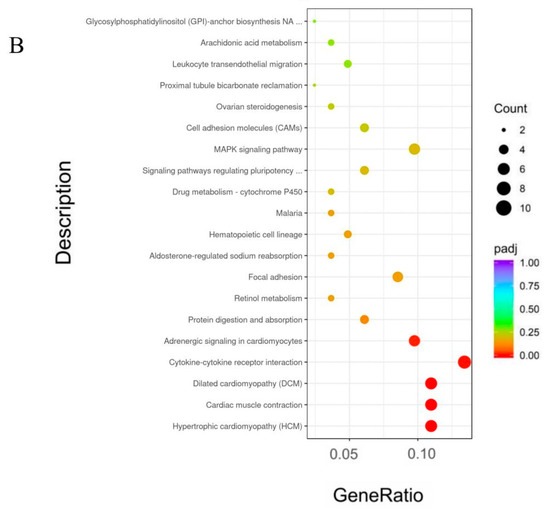 We used the KEGG database for DEG pathway annotation. Twenty-five pathways were significantly (p < 0.05) enriched among all the DEGs, including hypertrophic cardiomyopathy (HCM), dilated cardiomyopathy (DCM), cardiac-muscle contraction, focal adhesion, and MAPK signaling (Figure 4B).
