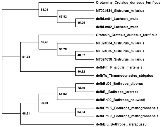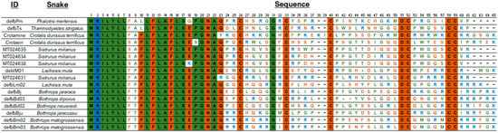 - Corrêa, P.G.; Oguiura, N. Phylogenetic analysis of β-defensin-like genes of Bothrops, Crotalus and Lachesis snakes. Toxicon 2013, 69, 65–74. [Google Scholar] [CrossRef]
