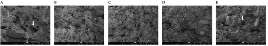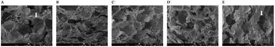 Scanning electron micrograph of kibbles produced with different inclusions of citrus pulp and with a die diameter (dd) of 7 mm. (A–E) correspond to the internal area of the CO, CPP5, CPP10, CPP15 and CPP20 diets, respectively (Increase of 37×). CO = control food, without added citrus pulp pellet; CPP5 = addition of 5% citrus pulp pellet; CPP10 = addition of 10% citrus pulp pellet; CPP15 = addition of 15% citrus pulp pellet; CPP20 = addition of 20% citrus pulp pellet. Arrows indicate internal cells: in A, the cells are formed with thick cell walls; in E, a continuous mass without identifiable cell structure is observed.