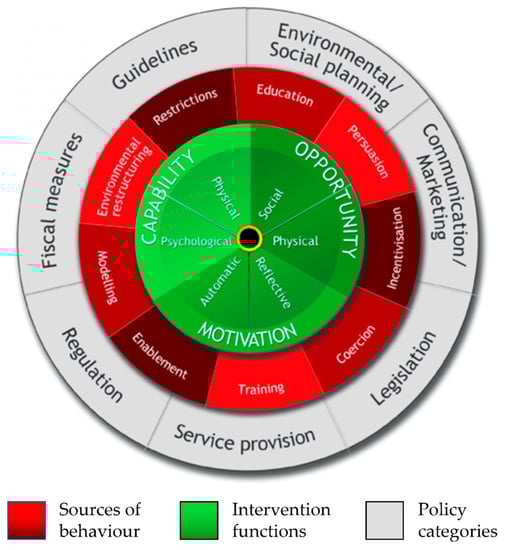 When Michie et al. [32,33] developed the COM-B model, they also defined nine ‘intervention functions’ and seven ‘policy categories’. Taken together, these components form the Behaviour Change Wheel (Figure 2).