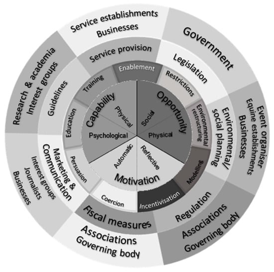 Figure 2 shows the original Behaviour Change Wheel, as published by Michie et al. [32,33], in which they identified overarching policy categories for each of the intervention functions. However, if the Behaviour Change Wheel is to be used in the context of equestrianism, we advocate supplementing—or, if appropriate, replacing—these policy categories with the equestrian stakeholders that may be involved in the implementation of the interventions (Figure 3). By assigning behaviour change interventions to relevant stakeholders, these individuals/organisations become part of the behaviour change system, creating engagement and commitment within the wider equestrian community right from the start, thereby increasing the chances of sustained success [39].