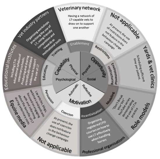 The Behaviour Change Wheel presents us with an opportunity to revise our approach to improving equine welfare. In addition to continuing to push for more research and the communication of factual information, we should focus on the implementation of behaviour change strategies that include reflective motivational components and that encourage engagement and interaction between the various stakeholders at different levels of the industry. A multifaceted, multi-stakeholder approach is likely to yield the greatest chance of success if it is aimed at the entire support network (i.e., the equestrian community), rather than focusing solely on the individual, and should be directed at all levels within equestrianism, from the grass roots level to the top level of elite sport.
