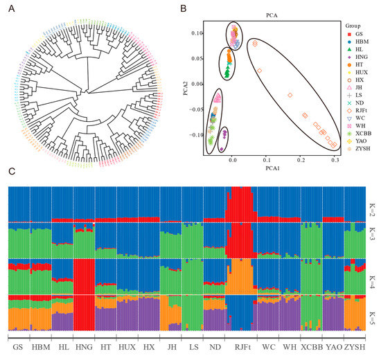 Genetic relationships and population structure between Henan indigenous chickens and other Chinese chicken breeds. (A) Neighbor-joining (NJ) phylogenetic tree of 16 breeds. (B) Principal component analysis (PCA) of 16 chicken populations. (C) Admixture analysis across 16 chicken populations. Proportions of genetic ancestry for 16 chicken populations with K = 2–5 (K represents the number of inferred ancestral populations. Different colors represent assumed ancestors).