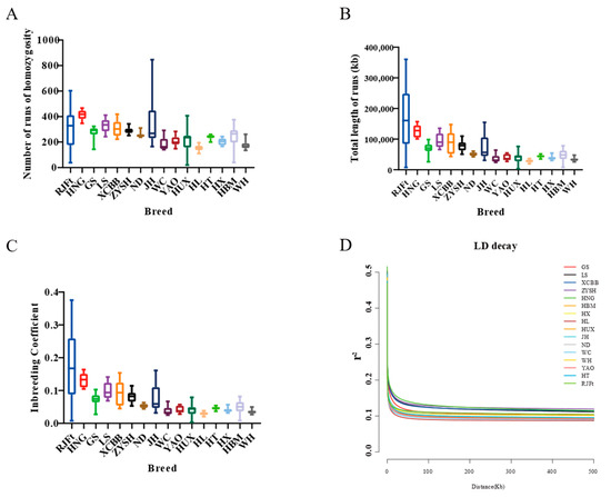Runs of homozygosity and linkage disequilibrium of different indigenous chicken breeds and red jungle fowl. (A–C) Statistical for runs of homozygosity and genomic inbreeding coefficient of different breeds. (D) Decay of linkage disequilibrium in the 16 chicken populations.