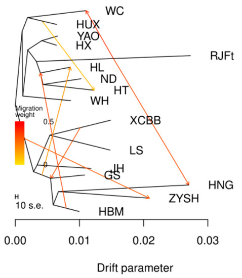 Analysis of gene flow. A maximum likelihood tree along migration events. Events relating to migration are represented as colored, weighted arrows. Parallel branch lengths are proportional to the degree of genetic drift that has appeared on each branch. The scale bar displays a standard deviation that is 10 times the mean of the values in the sample covariance matrix.