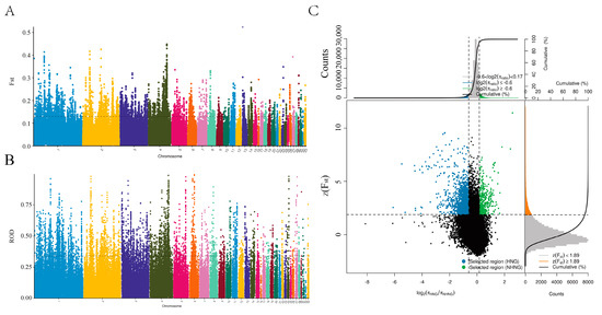 Whole genome scanning of the selection signatures between HNG and NHNG chickens. Selection signals distribution of (A) FST, (B) ROD calculated for 40 kb windows sliding in 10 kb steps. (C) Signals intersection by FST and ROD. Blue points represent (HNG selected genomic regions with both an extremely high Z (FST) value (top 5% level) and ROD value (top 5% level).