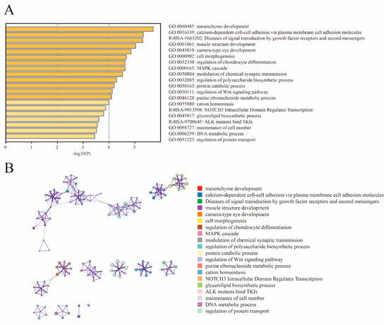 Enrichment analysis of common selected genes in gamecock chickens and those specific to HNG using Metascape. (A) Functional enrichment analysis of 52 common selected genes. (B) Functional enrichment analysis of 347 unique selected genes.