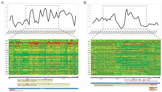Long-term selection alters the patterns of variation in certain genomic regions leading to increased allele frequencies, the degree of linkage disequilibrium, and a reduction local diversity [7,8]. Simultaneously, the genomic regions linked to the sites are fixed due to the genetic hitchhiking effect [9]. The distinctive genetic traces or imprints left in the genomic regions are signatures that underwent selection [10], which can be effectively detected by selective sweep analysis [11,12,13]. Different statistical parameters, such as fixation index (FST), nucleotide diversity (π), and reduction of diversity (ROD), have been proposed according to the investigated selection signatures that are within populations or between populations [14,15]. Among these methods, the FST is usually used to quantify the degree of population genetic differentiation between populations [16]. The π represents nucleotide polymorphisms, and decreases with increasing levels of selection. The detection power of selection signatures has been suggested to be improved by combining several statistical methods [17]. Numerous chicken selection signatures have been studied in depth, including those related to feather color [18], comb size [19], and skin color [20], as well as those relating to bidirectional selection of body weight [21], and regional and commercial breed features [22].