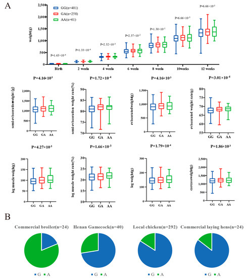 The genomic regions with the most significant selective signals occurred in chromosome 1: 42,880,001–42,970,000, containing the transmembrane and tetratricopeptide repeat containing 3 (TMTC3) gene, and chromosome 4: 75,820,001–75,870,000, containing the ligand dependent nuclear receptor corepressor like (LCORL) gene and non-SMC condensin I complex subunit G (NCAPG) gene. The shared long-range haplotypes across the HNG population could be observed in TMTC3, and LCORL–NCAPG genes, respectively (Figure 6A,B). Furthermore, we analyzed the association between genotypes of SNPs in the LCORL gene and growth and carcass traits in the Gushi-Anka F2 resource population. Based on the previous genotyping-by-sequencing (GBS) data of the population [37], we detected six SNPs on the LCORL gene (Figure S3), two (Chr4: 75,854,181C>T and Chr4: 75,859,000G>A) of which were significantly associated with body weight (BW) at 0, 2, 4, 6, and 12 weeks of age; body size index including chest depth, breast bone length, body slanting length, and pelvis breadth; and carcass traits including semi-evisceration weight, eviscerated weight, semi-evisceration weight rate, eviscerated weight rate, breast muscle weight, leg muscle weight rate, and the other ratio of viscera (Table S5). For the SNP Chr4: 75,859,000G>A, the genotype AA was conducive to weight gain and chicken meat production (Figure 7A). The allele frequency of A was higher than that of G in broiler breed (Cobb), while reduced in gamecock breeds, and was lowest in other indigenous and layer breeds (Figure 7B). These results further supported that the strong selection of LCORL gene in HNG was related to body size and muscle development.