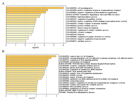 To further identify the selected genomic regions and genes that were unique to HNG and common to other gamecock chicken breeds, we integrated the candidate selective genomic regions of HNG with the candidate genomic regions of Chinese gamecocks, which were previously reported by Luo et al. (Table S6). Ref. [6], and identified 52 genes common to gamecocks (Table S7) and 347 genes unique to HNG (Table S8). These common selective genes were mainly involved in cell morphogenesis, neuron regulation, behavior, muscle organ development, female gonad development, regulation of secretion by cell, and positive regulation of glucose transmembrane transport (Figure 8A), while the unique selective genes in HNG were mainly involved in sensory organ development, neuron projection development, DNA metabolic process, epithelial cell differentiation involved in kidney development, protein ubiquitination, regulation of the Wnt signaling pathway, manipulation of chondrocyte differentiation, and muscle structure development (Figure 8B).