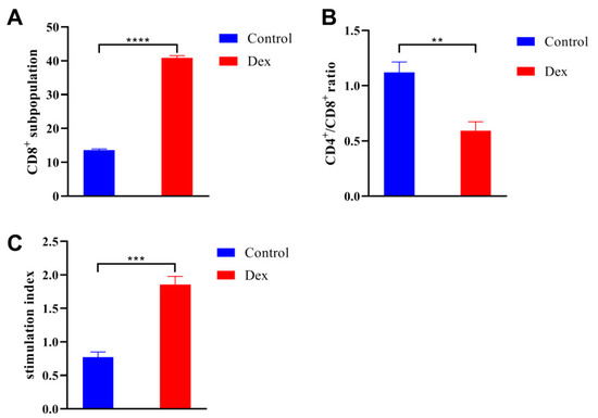 Dexamethasone sodium phosphate treatment lowered the immunity of ICR/CD-1 male mice. (A) Dexamethasone sodium phosphate treatment increased the percentage of CD8+ cells in the whole white blood cells. (B) The CD4+/CD8+ ratio from the Dex group was significantly lower than that in the control group. (C) The dexamethasone sodium phosphate treatment suppressed the viability of splenic T lymphocyte cells. All data are presented as means ± standard deviation. Two-way ANOVA was used for comparison between the two groups, and all statistical analyses were performed with GraphPad Prism 8. **** p < 0.0001; *** p < 0.001; ** p < 0.01.