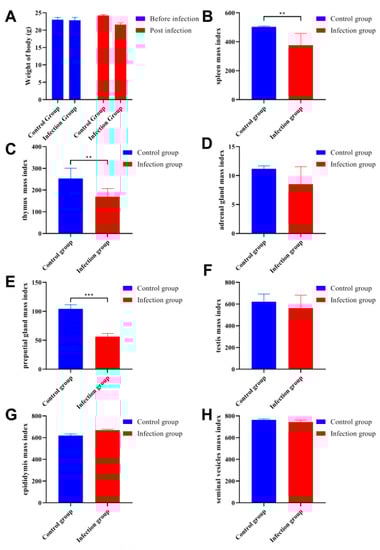 Before C. parvum infection, there was no difference in body weight between the infection group and control group. A total of 14 days after parasitic infection, the bodyweight in infection group was decreased but the difference was not significant under statistical analysis between the two groups (Figure 2A). After parasitic infection, the immune-related organs such as the spleen and thymus had decreased mass indexes (Figure 2B,C). The mass index of adrenal gland between the two groups showed no significant differences (Figure 2D). For the sex organs, only the mass index of the preputial gland from the infection group was decreased and showed significant differences (Figure 2E). Other sex organs including the testis, epididymis, and seminal vesicles did not show obvious differences when compared with the control group (Figure 2F–H).