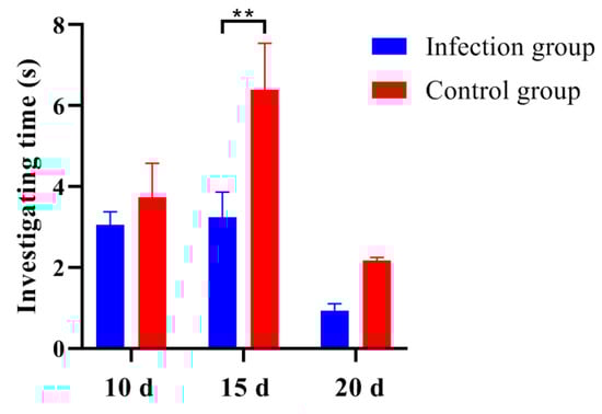 The parasitic infection decreased the attractiveness of ICR/CD-1 male mouse urine to females. Attractiveness was evaluated by recording the cumulative duration of female mice in sniffing and exploring the different urine samples within 3 min. All data are presented as means ± standard deviation. Two-way ANOVA was used for significance analysis, and all statistical analyses were performed with GraphPad Prism 8. ** p < 0.01.