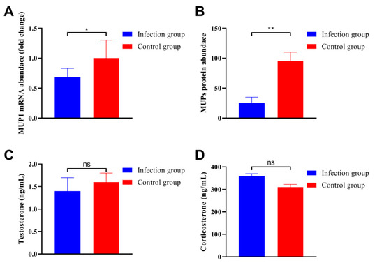 MUP is the transporter of a variety of ligands, including pheromones, steroid hormones, retinoids, and lipids [54], and different MUP subtypes are highly homologous [55]. MUP is mainly expressed in liver with a sex-dimorphic pattern, and the expression levels are several times higher in males than in females [54]. The expression level of MUP can be regulated by multiple hormones including testosterone, growth hormone, and thyroxine [4]. In this study, parasitic infection reduced the expression level of MUP, but the levels of testosterone and corticosterone in serum were not affected significantly, which indicated that parasitic infection could reduce the MUP expression level directly.