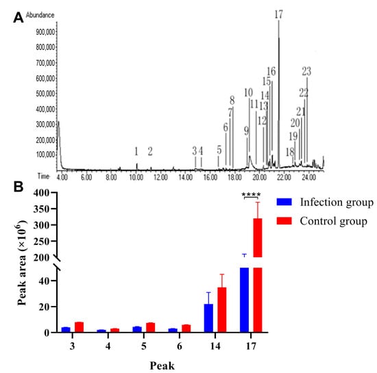 GC-MS analysis was performed to analyze the volatile compounds in the secretions separated from the preputial gland, and the representative gas chromatogram from the infection group was presented in Figure 5A. The date were compared with the mass spectrometry libraries: published papers were also referenced [31,32]. In brief, we identified a total of 23 volatile compounds in the secretions of the preputial gland. The absolute abundance (peak area) and relative abundance (percentage of total) of the volatile compounds in the two groups are compared and listed in Table 2. The results indicated that the absolute abundances of Z-7-tetradecen-1-ol, 1-tetradecanol, Z-5-tetradecenol acetate, 1-tetradecanol acetate, 1-hexadecanol acetate, and 1-hexadecanol acetate from the infection group were significantly lower than those in the control group (Figure 5B).