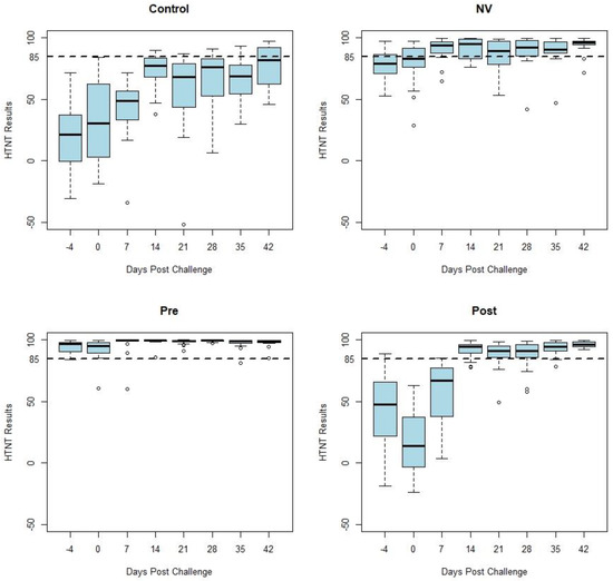 Box-and-whisker plots of the HTNT antibody response curves by the days post challenge for each treatment group. The middle bar represents the median value of the results by week. The hinges (top and bottom of the box) represent the first (Q1) and third (Q3) quartiles. The shaded region represents the interquartile range (IQR). The whiskers are determined as follows: Top whisker = Q3 + 1.5∗IQR; Bottom whisker = Q1 + 1.5∗IQR. If no data point is at the calculated value, the next data point closest to Q1 or Q3 is the limit of the whisker. Open circles (◦) indicate outliers. A cut of 85 is denoted by the dashed line at 85 on the y-axis.