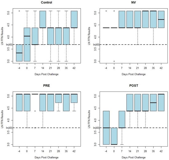 Box-and-whisker plots of the FFN antibody response curves by the days post challenge for each treatment group. The middle bar represents the median value of the results by week. The hinges (top and bottom of the box) represent the first (Q1) and third (Q3) quartiles. The shaded region represents the interquartile range (IQR). The whiskers are determined as follows: Top whisker = Q3 + 1.5∗IQR; Bottom whisker = Q1 + 1.5∗IQR. If no data point is at the calculated value, the next data point closest to Q1 or Q3 is the limit of the whisker. Open circles (◦) indicate outliers. A cut of 40 is denoted by the dashed line at ln(40) on the y-axis.