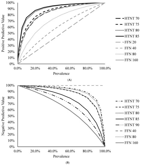 (A). Positive Predictive values for the HTNT (black lines) and FFN (gray lines) assays at various cutoffs. A cutoff of 90 is not represented for the HTNT. (B). Negative predictive values or the HTNT (black lines) and FFN (gray lines) assays at various cutoffs. A cutoff of 20 is not represented for the FFN assay.